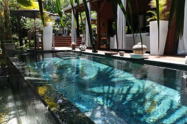 Im Schatten eines riesigen Gartens mit Palmen, Frangipani und Kaktusbäumen laden unsere vier Bungalows zum Entspannen und Ausruhen ein.